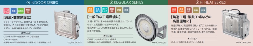 器具はすべて金属製で、照射レンズには強化ガラスを採用しています。経年劣化による変色を防ぎ、長期にわたって高い耐久性を維持します。一般的な工場向けモデルから、鋳造・製鉄工場向けの高温対応モデルまで幅広いラインナップがあります。
